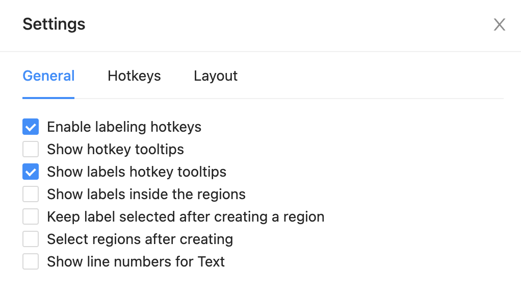 For example, keep a label selected after creating a region, display labels on bounding boxes, polygons and other regions while labeling, and show line numbers for text labeling.